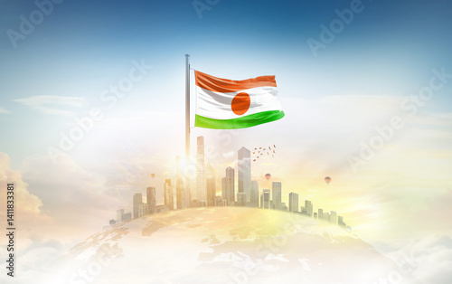 Niger flag wavering on globe with modern building skyline. Flag waving on world map. Niger national flag for independence day.
