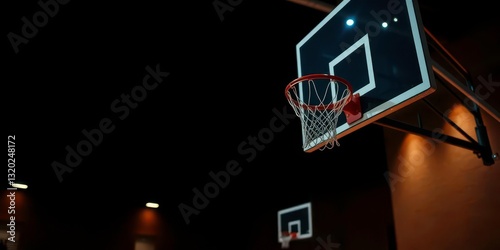 Night basketball hoop, soft ambient glow illuminates court, shadows, evening
