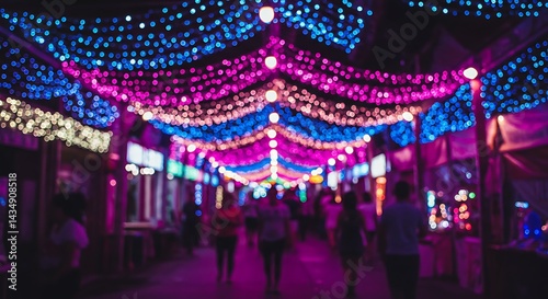 night, light, colourful, street, festival, celebration, illumination, vibrant, glowing, purple, pink, blue, alleyway, paseo, crowd, people, evening, ambience, festive, decor, bright, market, blurry, bokeh, atmosphere, magical