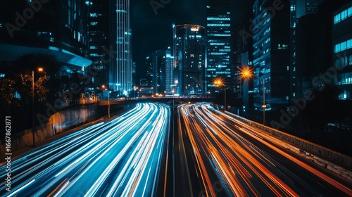 night, city, highway, light, trail, urban, traffic, movement, blur, speed, modern, building, skyscraper, dark, vibrant, colours, blue, orange, yellow, fast, motion, long, exposure, architecture, evening, concrete, perspective, technology, city landscape, glow, tunnel, street, street light, view, light