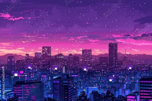 city, purple, night, building, architecture, sky, illustration, aesthetic, nature, neon, technology, japanese, minimal, sunset, cloud, blue, pink, landscape, city landscape, outdoors, grain, metropolis, skyscraper, panorama, office, noise, feeling, detail, nostalgic, horizon, skyline, bright, less, town, illuminated, building exterior, city life, evening, urban, dusk, highrise