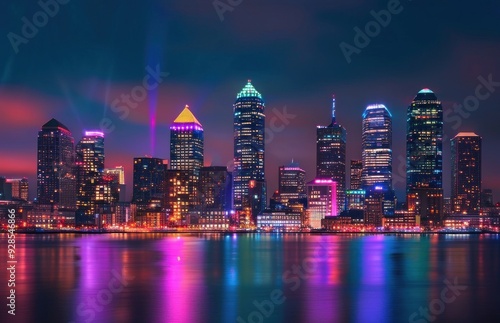Night city skyline illuminated by bright lights.
