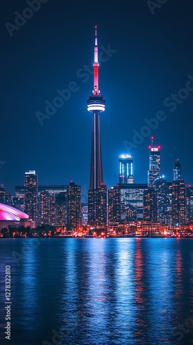 city, skyline, tower, night, urban, canada, toronto, building, light, architecture, downtown, metropolis, landscape, scenery, evening, dark, illumination, city landscape, modern, background, panorama, view, travel, vacation, tour tourism, nightlife, building, structure, glasses, steel, concrete, water, lake, river, sky, star, bright, beautiful