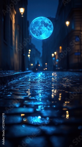 moon, night, city, street, rain, cobbled, person, walking, fantasy, urban, dark, blue, nightlife, atmosphere, mystery, magical, dreamy, romance, solitude, wet, light, old, europa, travel, architecture, building, landscape, scenery, background, wallpaper, image, photo, picture, mood, evening, gloomy, serene, mysterious, enigmatic, peaceful, calm, still, quiet, lonely, deserted, city landscape