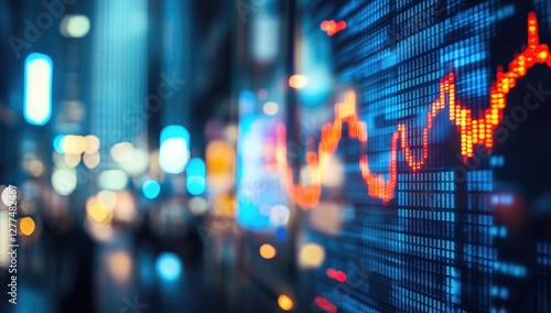 stock exchange, falling, chart, night, city, street, screen, display, business, decayed, economy, investment, financial, technology, datum, graph, red, number, market, trend, downward, indicator, analysis, digital, blurred, background, global, finance, stock, trading, figure, down, growth, trend
