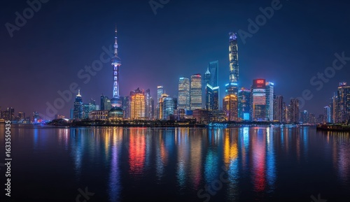 Night cityscape, river reflection, illuminated skyscrapers, China, tourism