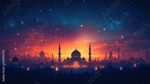 night, city, mosque, star, sky, sunset, orange, blue, purple, building, architecture, islamic, religion, faith, spirituality, culture, tradition, landscape, panorama, scene, illustration, digital, art, graphic, design, background, wallpaper, vector, image, picture, photo, vibrant, colourful, majestic, mystical, serene, peaceful, calm, hope, beauty, wonder, magic, glow, light, darkness, silhouette, horizon, dome, minaret