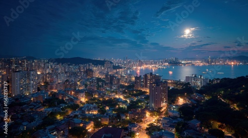 city landscape, night, moon, urban, architecture, illumination, landscape, skyline, building, light, aerial, view, horizon, skyscraper, illuminated, photo, travel, city, beautiful, moonlight