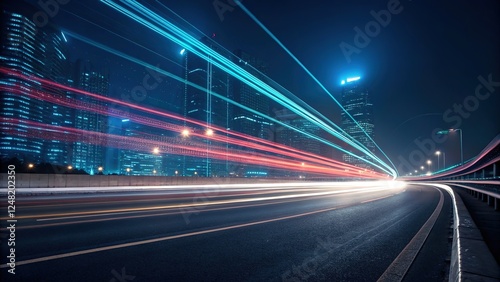 night, city landscape, highway, city, urban, transportation, traffic, road, speed, motion, long exposure, light, building, modern, architecture, infrastructure, travel, commuting, evening, dark, metropolis, skyline, neon, blurred, dynamic, fast, vibrant, illuminated, rush hour