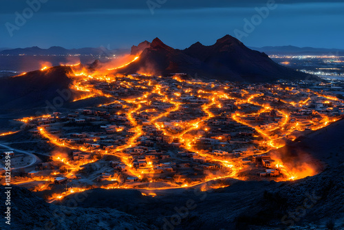 night, fire, mountain, village, illustration, landscape, hill, house, flames, darkness, glow, burning, aerial, view, fiery, orange, red, dusk, twilight, illumination, scenery, picturesque, vibrant, dramatic, intense, warm, light, energy, heat, power, nature, environment, rural, remote, scenic, beauty, wonder, majestic, spectacular, amazing, breathtaking, surreal, fantasy, magical, mysterious, captivating, inferno, blaze