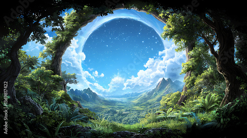forest, tree, night, star, sky, moon, cloud, vale, landscape, nature, enchanted, magical, dreamy, serene, tranquil, peaceful, mystical, fantasy, heavenly, celestial, lush, green, leaf, circular, opening, view, soft light, atmosphere, dark, bright, beautiful, amazing, marvellously, fantastic, scenic, picturesque, artistic, creative, illustration, digital artwork, artwork, painting, image, photo, photo