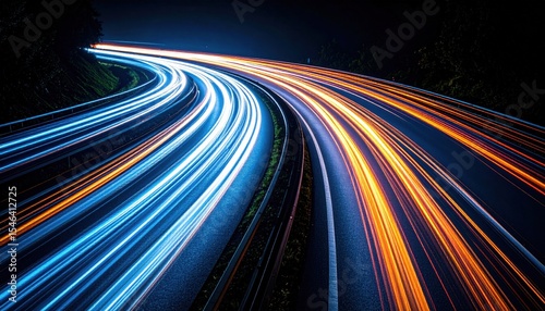 night, highway, light, speed, motion, blur, road, travel, car, car, trail, city, urban, evening, night time, illuminated, glowing, fast, moving, light, abstract, pattern, blue, yellow, orange, white, driving, curve, roadway, automobile, traffic, view, photo