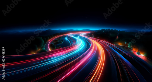 Night highway with vibrant light streaks. Vehicles speed along winding road, illuminating the dark landscape with colorful motion trails.