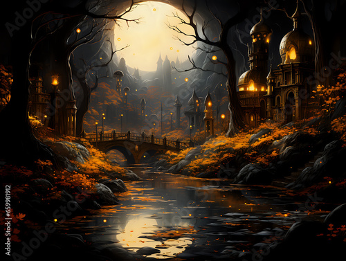 night in the forest, magical scene, gold and black magic forest