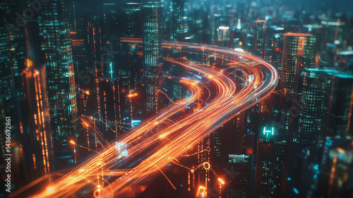 nightlight, modern, business, network, interconnected, city landscape, future, smart, wireless, connect, people, night, city, technology, light, urban, building, skyline, view, computer, design, skyscraper, architecture, street, bangkok, energy, pattern, light, dark, traffic, digital, aerial, downtown, motion, datum, transportation, application, software, cyberspace, solution, skyscraper, tech