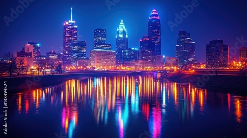 city landscape, night, river, skyline, urban, light, building, city, downtown, cleveland, ohio, cuyahoga, water, architecture, skyscraper, illuminated, evening, nightlife, modern, metropolis, city landscape, colourful, vibrant, dazzling, glimmering, sparkling, bright, scenic, beautiful, picturesque, stunning, breathtaking, amazing, marvellous, spectacular, magnificent, grand, impressive, captivating