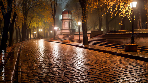 Night park after rain, illuminated by lanterns. Generative AI technology.