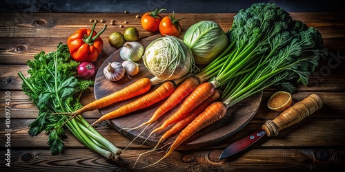 Night Photography of Fresh Raw Vegetables: Carrots, Onions with Peel, and White Cabbage on a Rustic Wooden Board Showcasing Healthy Vegetarian Food