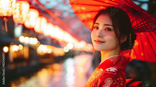 night portrait street photography of attractive young asian woman wearing red kimono, contemporary look, street style