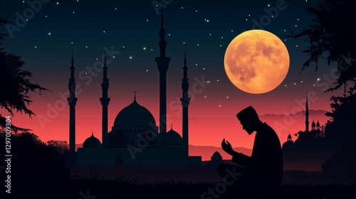 Night Prayer Silhouette: A devout silhouette kneels in prayer under the soft glow of the moon, with a mosque backdrop. a beautiful representation of faith, reflection, and reverence.