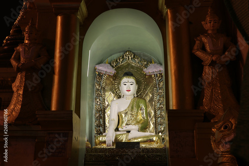 Night shot of stucco buddha statue decorated in golden be enshrined inside the arch at Shwedagon Pagoda, Yangon.