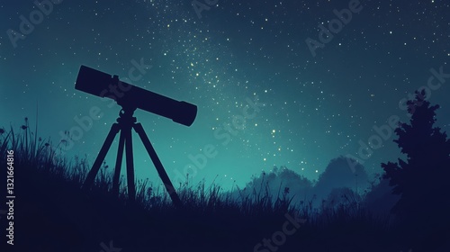 Night Sky Observation with Telescope Silhouette Against Starry Background in a Serene Nature Setting at Dusk