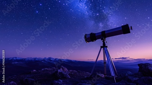 Night sky telescope positioned on mountain peak.