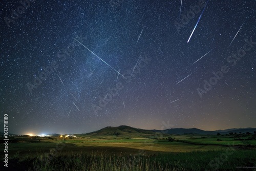 night, sky, star, meteor, shower, landscape, hill, field, grass, light, dark, astronomy, cosmos, universe, shooting, streak, trail, light, bright, motion, astral, space, planet, galaxy, celestial, beautiful, nature, amazing, view, photo, photo, horizon, panorama, clear, rural, countryside, natural, evening, night time, dramatic, wide, fisheye, meteor