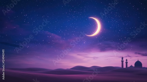 night sky, crescent moon, star, mosque, silhouette, islamic, spiritual, arabic, muslim, islam, faith, religion, astronomy, landscape, horizon, purple, pink, night, sky, moon, cloud, building, architecture, desert, sand, illuminated, glow, golden light, dreamy, magical, mystical, peaceful, serene, amazing, beautiful, stunning, photographic, artistic, creative