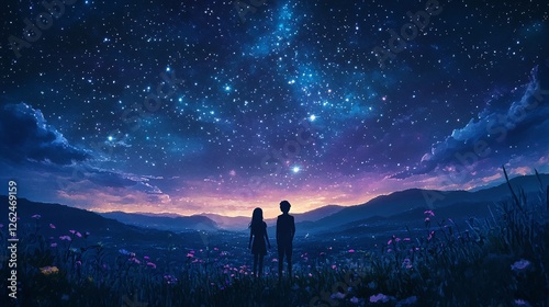 Night sky with sparkling stars in a watercolor painting, blending deep blues and purples for a serene, enchanting celestial scene.