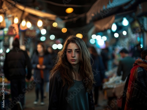 woman, night, street, crowded, light, expression, determined, cinematic, atmosphere, blurry, detail, portrait, urban, market, sharpened, depth, walking, brunette, hair, jacket, moody, ambient, bokeh, warm, cool, tone, shadow, illuminated, city landscape, people, anonymous, background, dark, glow, intense, serene, contrast, seriousness, resolve, mysterious, narrative, storytelling, captivating, candid, soft, light, fleeting, moment, realism