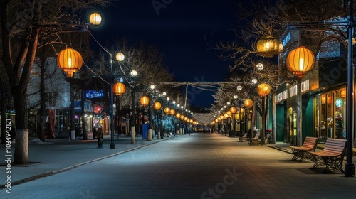 street, night, city, light, illumination, urban, landscape, architecture, building, sidewalk, pavement, lamp, street light, street light, light, lantern, lantern, glow, dark, evening, night time, empty, quiet, peaceful, tranquil, calm, atmosphere, mood, perspective, long, straight, view, horizon, tree, sky, winter, snow, frost, cold, glacé, deserted, solitude, loneliness