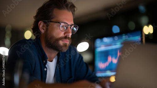 Night Trader Analyzing Market Trends in a Dark Office Setting