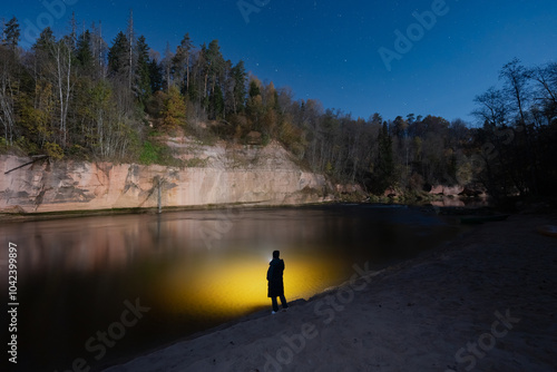 flashlight, sandstone, sand, river, latvia, landscape, starry sky, night, beautiful, hiking, girl, blond, adventure, sky, famous, water, cliff, forest, nature, walking, traveling, holiday maker, star, 1, lifestyle, timberland, young, hiker, hike, twilight, dark, beach, coat, woman, female, moonlight