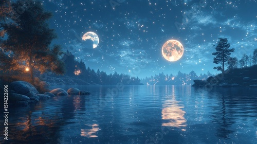 Nightly lake scene, starry sky, two moons