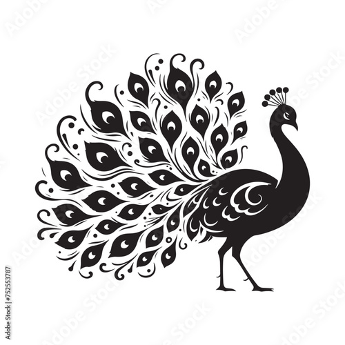 peacock, silhouette, vector, bird, majestic, elegance, brilliancy, avian, feather, plumage, beauty, display, vibrant, colourful, exotic, regal, tail, fanned, ornate, black, shadow, night, mysterious, enigmatic, nocturnal, wildlife, nature, birding
