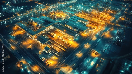 Nighttime aerial view of a brightly lit freight terminal, highlighting the scale of global cargo operations