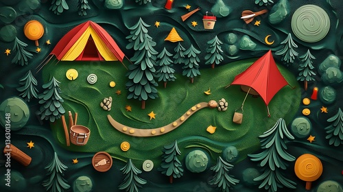 Nighttime Camping Scene: Paper Craft Illustration of a Forest Campsite AI Generated