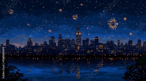 city skyline, tall building, fireworks, night sky, skyscraper, city landscape, city lights, night scene, digital artwork, fireworks display, vivid colors, nightscape