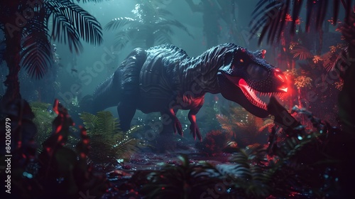 dinosaur, night time, jungle, prehistoric, tyrannosaurus, dense forest