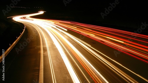 Nighttime long exposure of a road. A vibrant long exposure shot capturing the dynamic lights of cars traversing a road at night, reflecting the urban pulse