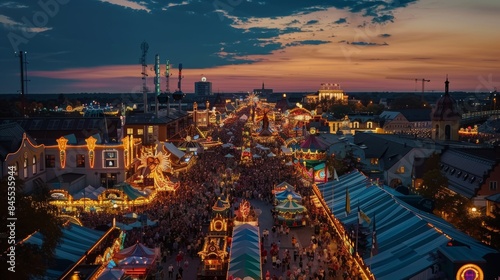 oktoberfest, parade, dusk, illuminated, crowd, festive, celebration, bavarian, float, evening, sky, tent, festival, carnival, tradition, german, night, holiday, cultural, light, entertainment, spectacle, enjoyment, street, aerial, panoramic, colours, sunset, party, atmosphere, people, building, tower, amusement, seasonal, gathering, booth, fun, lively, city landscape, european, twilight