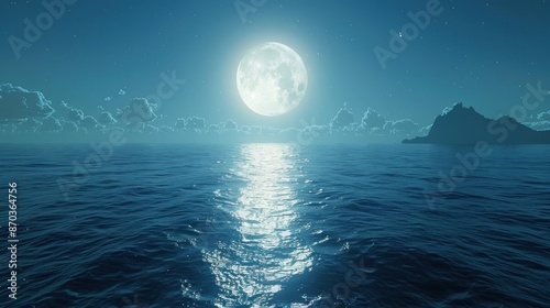 ocean, landscape, sea, night, peaceful, blue, surface, illustration, serene, scenery, deep, wallpaper, water, dark, calm, horizon, light, full, star, romantic, photo, digital, nature, tranquil, sky, astronomy, cloud, mountain, magical, glow, celestial, background, silhouette, art, beautiful, moon, mystery, abstract, wave, shimmer, dreamy, island