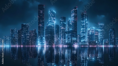 Nighttime view of a technologically advanced city with sleek, illuminated skyscrapers. Premium background for the latest technology needs.