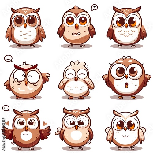 Nine Cute Cartoon Owls Expressing Emotions, Digital Illustrations, White Background, Social Media Use