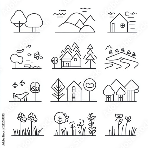 landscape, illustration, minimalist, nature, tree, house, mountain, hill, river, plant, flower, grass, design, line, art, icon, scenery, vector, simple, drawing, outline, graphic, scene, rural, bungalow, countryside, farm, field, wood, forest, park, garden, sky, sun, moon, star, wind, water, path, road, element, collection, set, style, image, picture, artwork