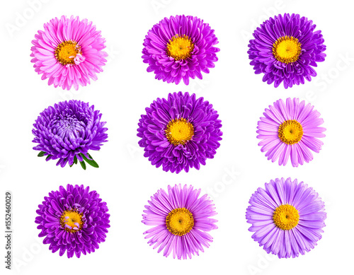 Nine vibrant aster flowers in various shades of pink and purple