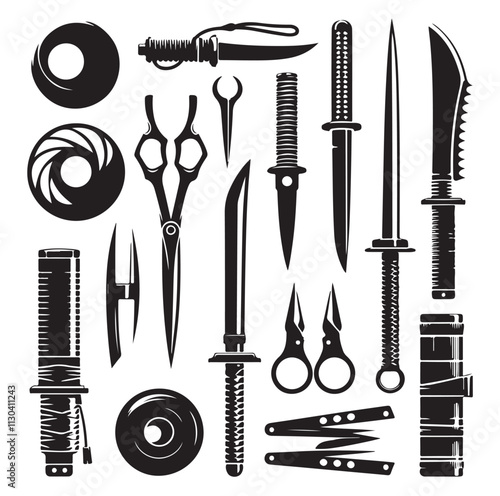 ninja, weapon, silhouette, stick, equipment, warrior, vector, arrow, shuriken, icon, throwing, star, sport, black, japan, training, japanese, set, military, bow, knife, tradition, sword, costume, samurai, traditional, razor, blade, spear, defense, arsenal, army, fighter, combat, collection, hook, asia, attack, dangerous, defend, fight, mortal, shot, spiked, throw