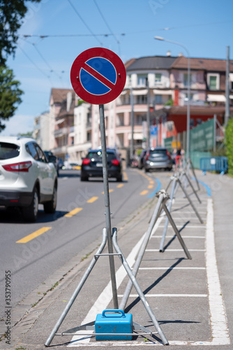 no parking, parking, forbidden, signs, road, traffic, street, warning, car, city, transportation, roadsign, restriction, transport, blue, urban, danger, red, safety, stop, sky, symbol, town, metal, not allowed, temporary, day, no people, nobody, information