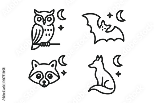 Nocturnal animals icon set. Line art collection of forest wildlife. Includes owl, bat, raccoon, and fox. Simple vector symbols for nature, night, and woodland themes.